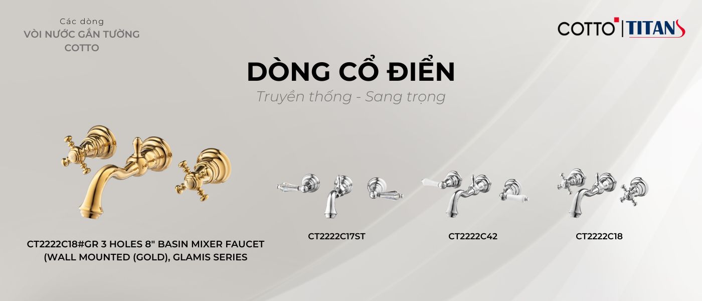 Dòng vòi nước cổ điển của COTTO đặc biệt phù hợp với những ai yêu thích vẻ đẹp truyền thống nhưng không kém phần sang trọng. Các sản phẩm này thường được mạ vàng hoặc kết hợp với các chất liệu như gỗ để tạo nên vẻ đẹp độc đáo và quý phái. Tiêu biểu trong dòng này có CT2222C18#GR 3 Holes 8" Basin Mixer Faucet, Glamis Series.